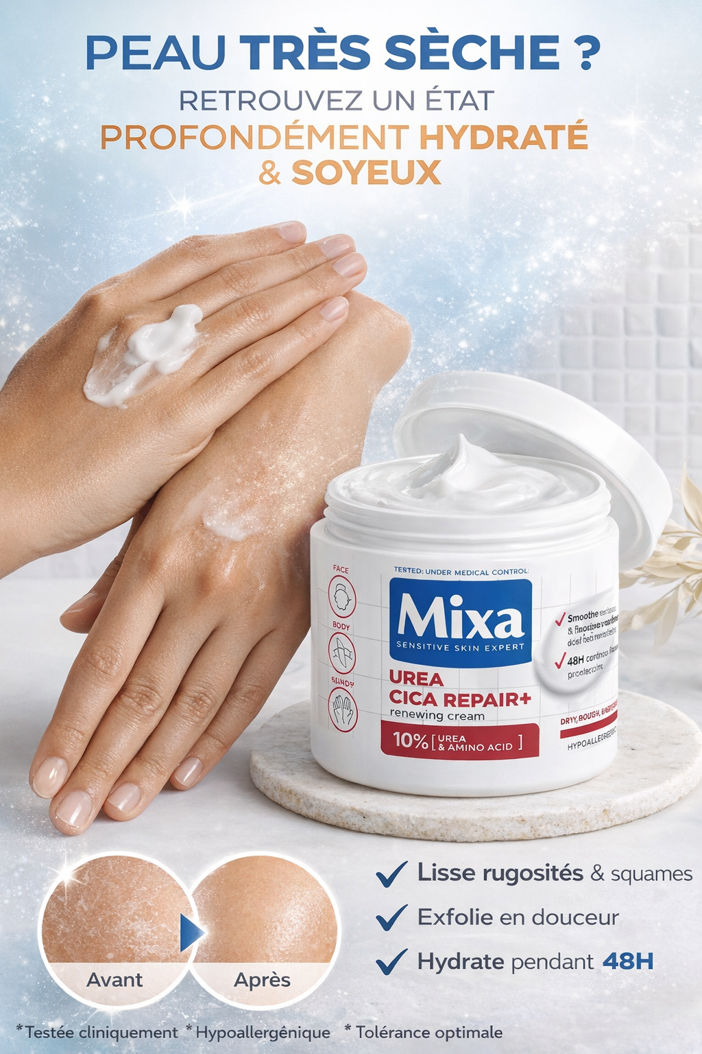 La crème pour le corps régénérante pour peaux très sèches MIXA Urea Cica Repair+ fait redécouvrir un état profondément hydraté et soyeux. Sa formule permet d’exfolier tout en douceur toutes les rugosités et les squames, gâchant la douceur voulue.